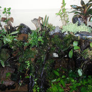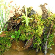 Der Aufbau des Landteiles wird idealerweise auf einem mit ca. 5cm Akadama (hart) bedeckten Bodenfilter vorgenommen. Akadama hält den biologischen Kreislauf stabil und baut auch Schadstoffe ab. In Kombination mit der oberflächlichen Bepflanzung funktioniert ein solches Reinigungskonzept über mehrere Jahre ohne ausgetauscht zu werden. Sicherlich kommt man um gelegentliche Teilwasserwechsel und Pflanzenpflege nicht herum.